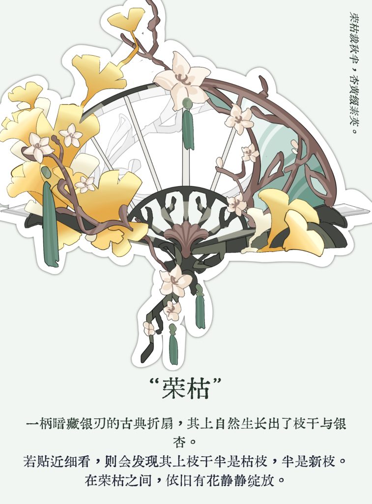 An antique folding fan conceals a silver blade, from which branches have sprouted—half withered, half in bloom—adorned with ginkgo leaves of apricot gold.